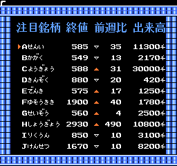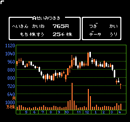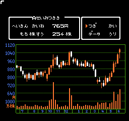 最初、大底の十字線とか出来高とか見て、インチキなしで売買してましたが、何かけっこうシビアで、なかなか儲けるのは難しいようです。内部的にもしかしたら面白い計算が行われているのかもしれませんが、バーチャルなチャート分析にとりくむぐらいなら、リアルにとりくんだ方がまし。ということで、さっさとインチキ技をつかってさっさとクリアしました(株価は最初に計算された後は、固定のようなので、セーブして時間をすすめた後、もう一度やっても同じ株価になります)。