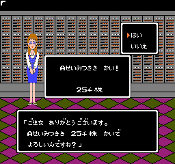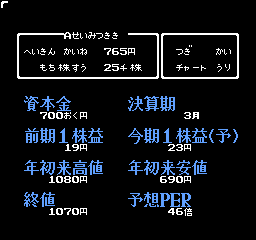 ゲームは、株をテーマにしたシミュレーションゲームです。期間内に元手の現金を増やすのがクリア条件です。初級、中級などのレベルがあり、初級は1年6ヶ月の間に1200万円に増やすのが条件です。