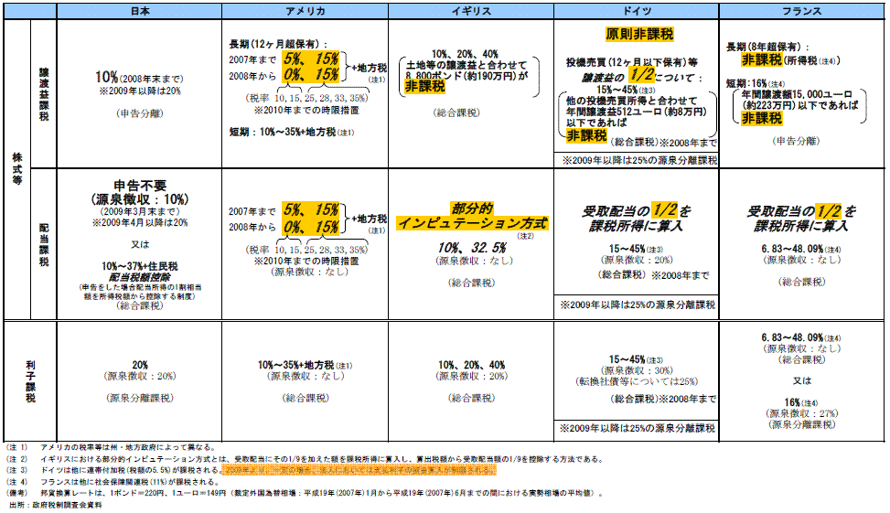 金融庁の平成20年度 税制改正要望項目には、各国の税率の国際比較の表がのっています。それを見ると、現在の日本の株式譲渡益の税率10%という数字は、欧米諸国(アメリカ、イギリス、ドイツ、フランス)より安いように見えます。