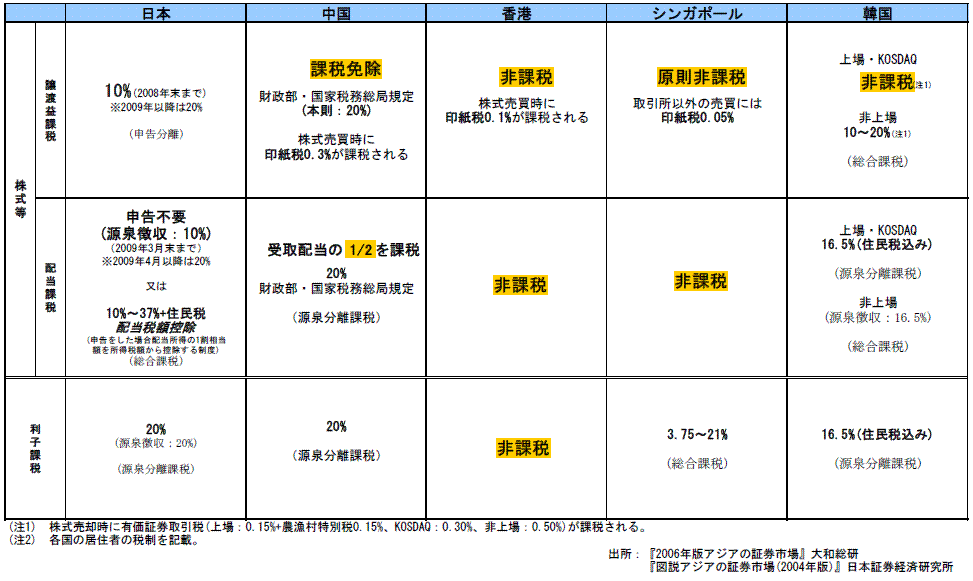 一方、アジア圏の国々と比較した表もあって、それを見ると、現在の日本の株式譲渡益の税率10%という数字は、アジア諸国(中国、香港、シンガポール、韓国)より高いように見えます。