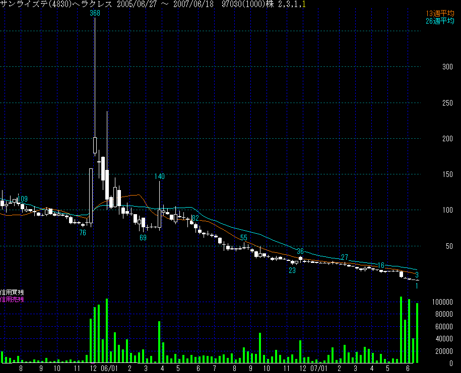 | サンライズ・テクノロジー | 4830 | ヘラクレス | 2005/12/27 | 2007/5/24 | 2007/6/22 | 2007/6/25 | 虚偽記載 | お知らせ 開示1 開示2 チャート1 チャート2 チャート3 株券 |