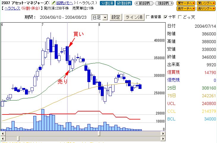 2337 アセット・マネージャーズ(ヘラクレス) 日付 売買 枚数 価格 2004/7/14 現物買 1 1,840,000 2004/7/15 現物売 1 1,600,000 損失 -240,000(値下がり率 -13.0%) / 2日