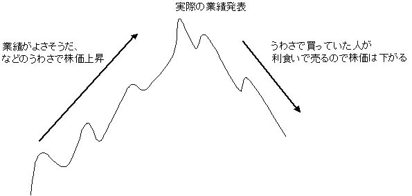 業績が好調らしい、いいニュースが出そうだなどのうわさで株価は上昇していきます。しかし実際にニュースが発表されてしまうと、うわさ以上のニュースでない限り、株価はその後、上がりません。逆に、好業績といううわさ通りのニュースであっても、その後株価は下げてしまう場合もあります。うわさは言い換えると期待です。期待によって株価は上昇していきますが、次に期待することがなくなると、もういいかなということで売ってしまう人が増え株価が下がってしまうのです。うわさや期待による上昇が大きいほど、下落も大きくなります。ちなみに、この好材料のうわさで株価が上がっていき、ニュースで下がるのと逆の動きが、悪材料出尽くしです。悪材料出尽くしでは、悪材料によってさんざん株価が下がっていきますが、売りたい人はみんな売ってしまって、これ以上悪いニュースもなくなると、後は上がるしかなくなります。