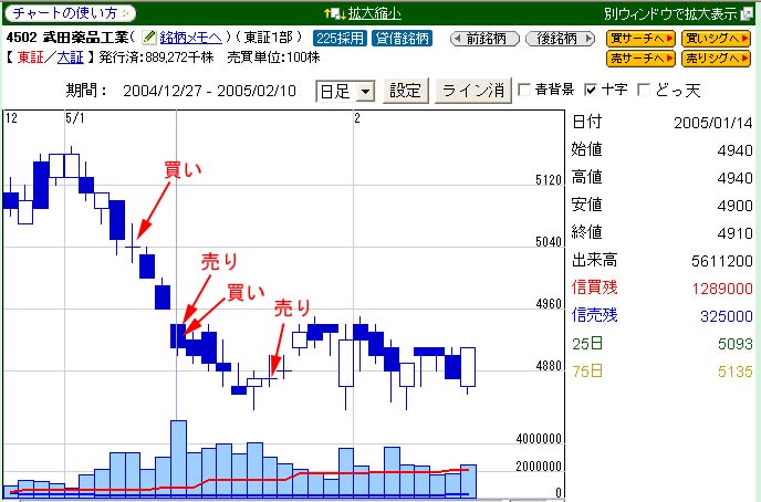 武田薬品。毎年確実に売り上げを増やしていおり借金もほんどない好財務の安定銘柄。2004年12月、ファイザーの副作用や糖尿病の開発中止などのニュースを受け一時的に下げていました。しかしそれらのニュースは一時的なもので、武田の将来性を左右するほどのものではありません。2005年明けても武田は徐々に下げていました。RSIやボリンジャーバンドなどを見ても通常はありえないほど下げつづけていました。