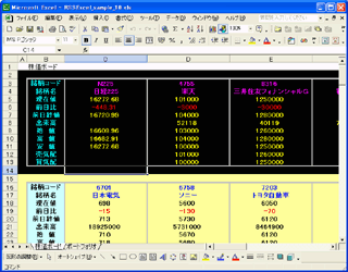 起動時に「このブックには、ほかのデータソースへのリンクが設定されています」というダイアログボックスが表示される場合は「更新する」を選択します。起動すると、次のような画面になります。ザラバ中であれば、株価などの値はリアルタイムに変化していきます。