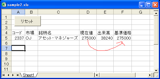 D5〜D9ぐらいのセルを範囲選択して、左上の名前ボックスで「現在値」と入力します。次にG5〜G9ぐらいのセルを範囲選択して同様に名前ボックスで「基準価格」と入力します。でもって、ボタンを押したときの処理を次のように変更します。