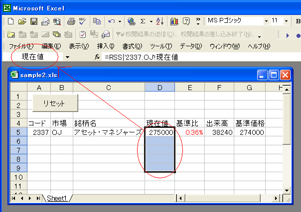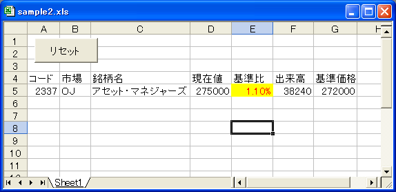次に、リセットボタンを押したときの価格(ここでは基準価格と呼ぶことにします)からの変動率を表示するようにしてみます。次の画面のように、現在値と出来高の間に一列挿入し、基準比というセルを作ります。