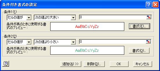 あと、上の画面では、基準比のとこが赤いフォントになっています。これはVBAで自分で処理を書いてもできますが、簡単な条件で色を変えるというのであれば、条件付書式が利用できます。条件付書式は、セルを選択して、メニューの書式→条件付書式で指定できます。