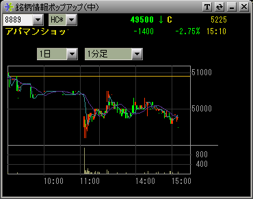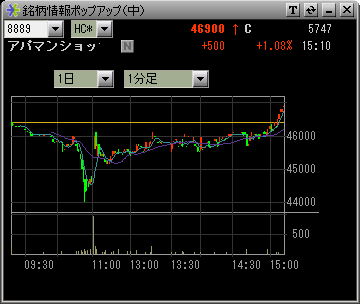 恐るべし!きっこの日記。というかアパ違いなんですが。。。お昼をはさんでみんな勘違いだったことに気づいたのか、株価は急激に戻します。いやー、しかし株式市場ってこんな愉快なことも起こるから面白いですね。