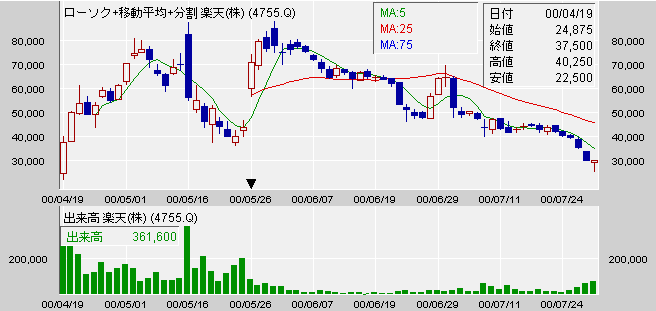 楽天上場直後の日足チャート(分割後の価格になってるので目盛りは当時の価格と違うけど、だいたいの雰囲気)