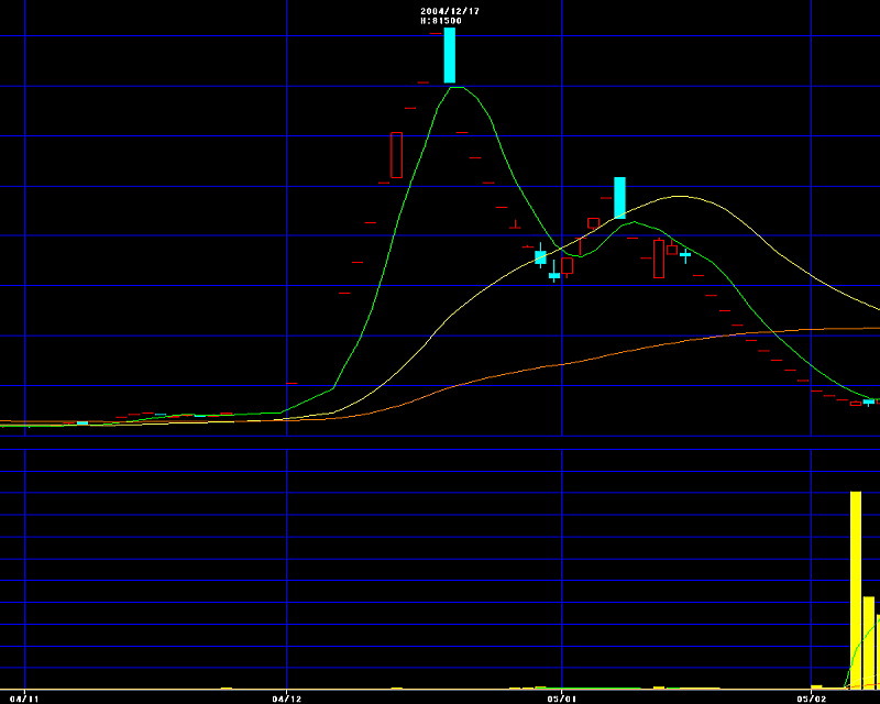 分割前日の11/24日からストップ高をつけ、そこから17営業日連続でストップ高をつけます。株価は4450円(11/24終値÷100)から、81500(12/17高値)へ18.3倍になります。分割前からの保有株は1/100株しか売れませんが、12/1にそれなりに出来高が出来ているのに、そこからさらに上昇するのがなかなかすごいところです。ちなみに、12/17はチキンレースの終点でそれ以降しばらくストップ安が続きます。